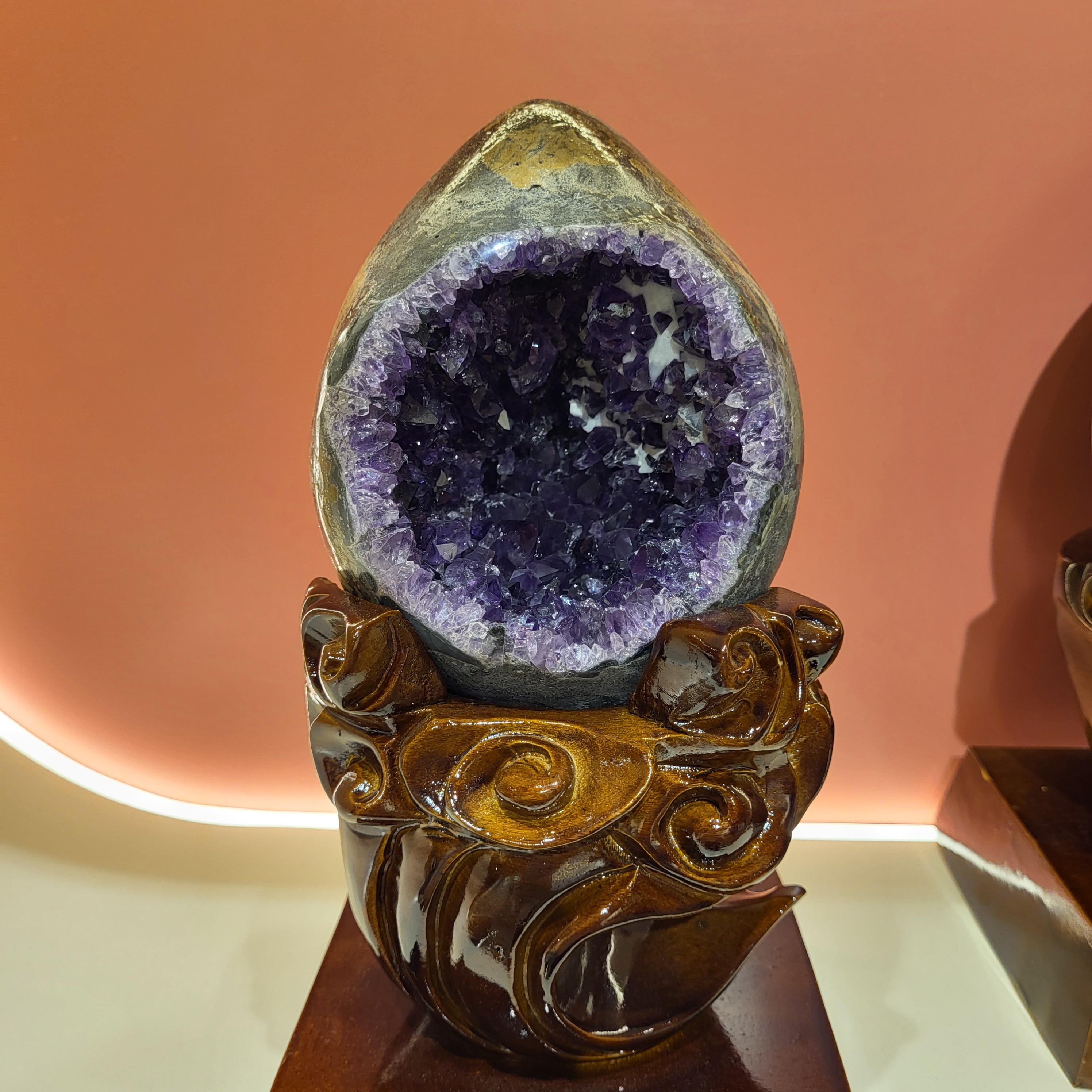 《紫晶恐龍蛋晶洞》 晶洞內部的深度夠深,聚財能力超強,洞口非常闊大,招財功效相當出色,而且紫晶牙深紫又閃,可放室內辦公室,家中或鋪頭 💁🏼♀️紫晶恐龍蛋晶洞功效: ⭐️可以招財,對於營業場所、店家,或是經營自己的事業的人更有幫助 ⭐️能招來貴人,提升升遷的運勢,提升人的大腦效率、能力有幫助,可以幫助思考、增長智慧、提升靈性和直覺力、增加記憶力 ⭐️具有很強大的能量,可以助其他水晶短暫能量提升,只要把小型的水晶飾品放進洞裡,就能達到其的功效